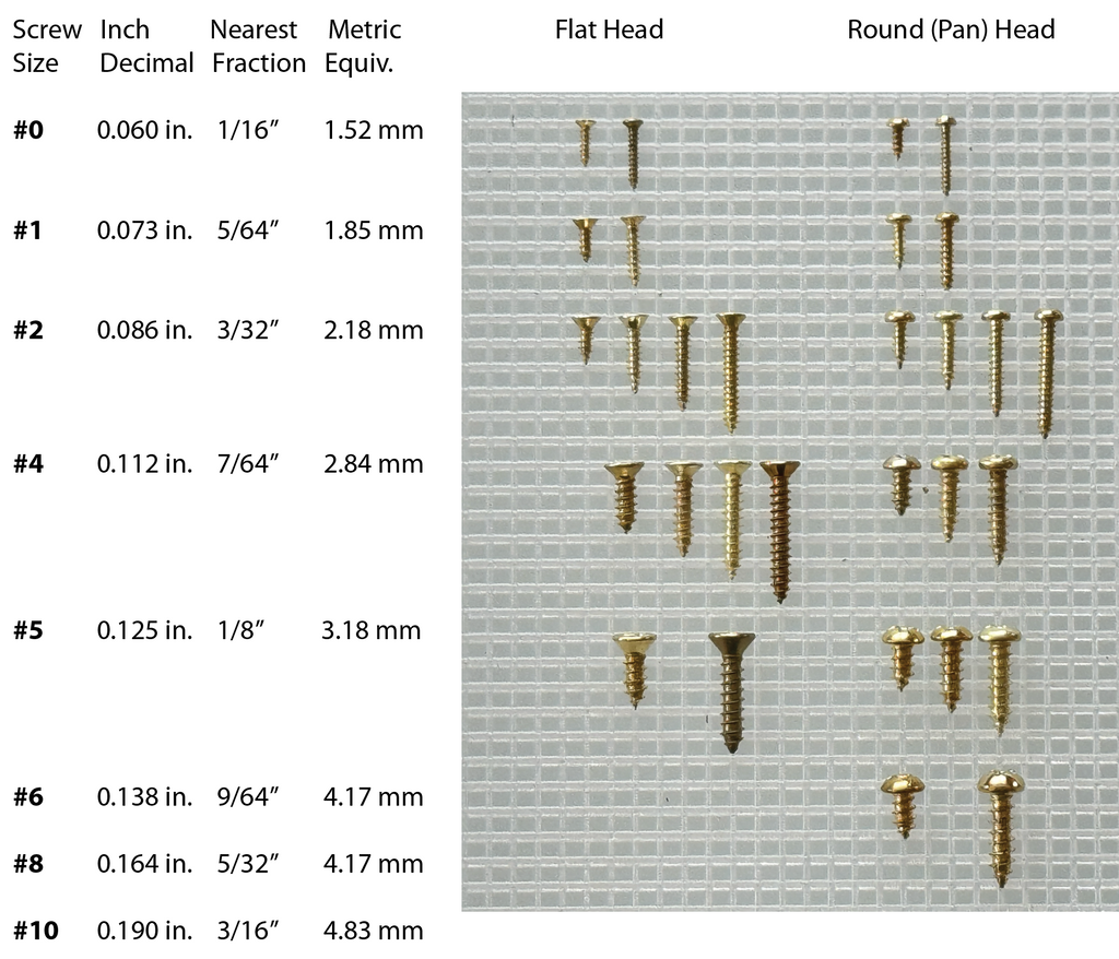 Shown are the Brass Finish Screws we carry at the moment. All are Phillips Head, which you will especially appreciate in the small sizes!  The diagram is a 1/8" grid and...