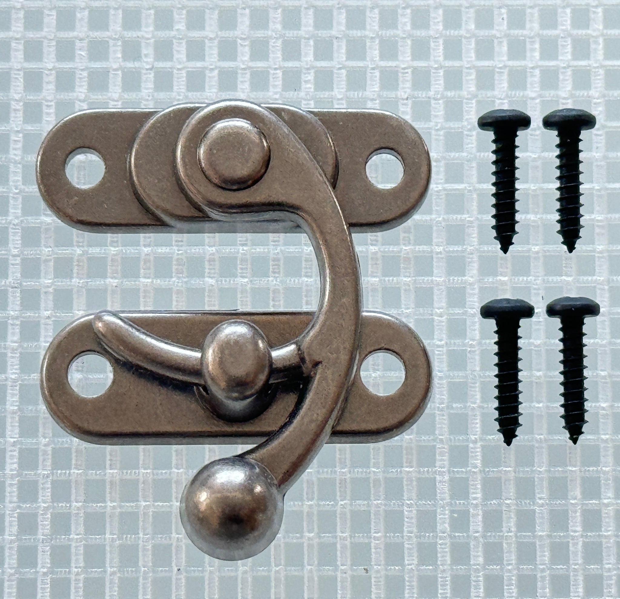 A larger Swing Catch. Sizes given are overall width by height. Attach with #4 Round Head Screws.