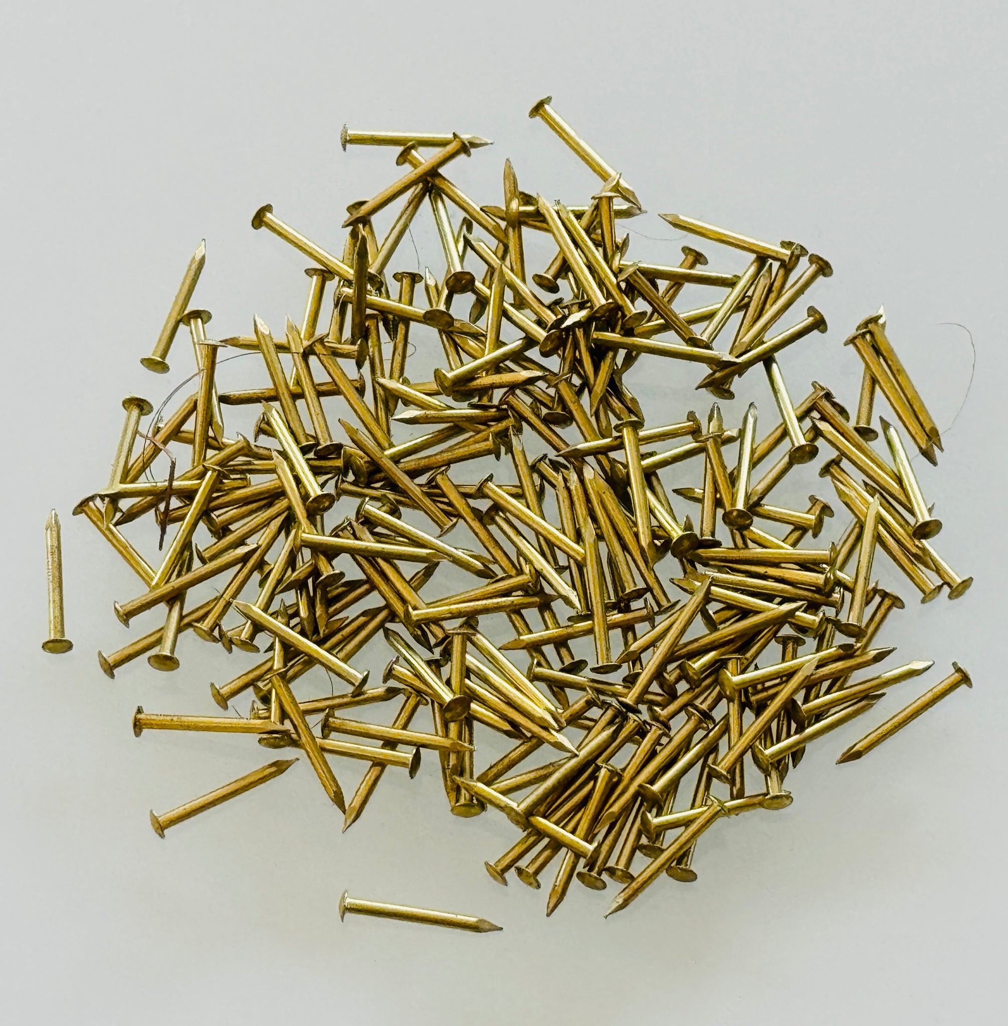 Solid Brass Escutcheon Pins are a true sign of old-world craftsmanship and add the finishing touch to any project. Aprox. 150 per Oz. or Aprox. 6 per Gram.